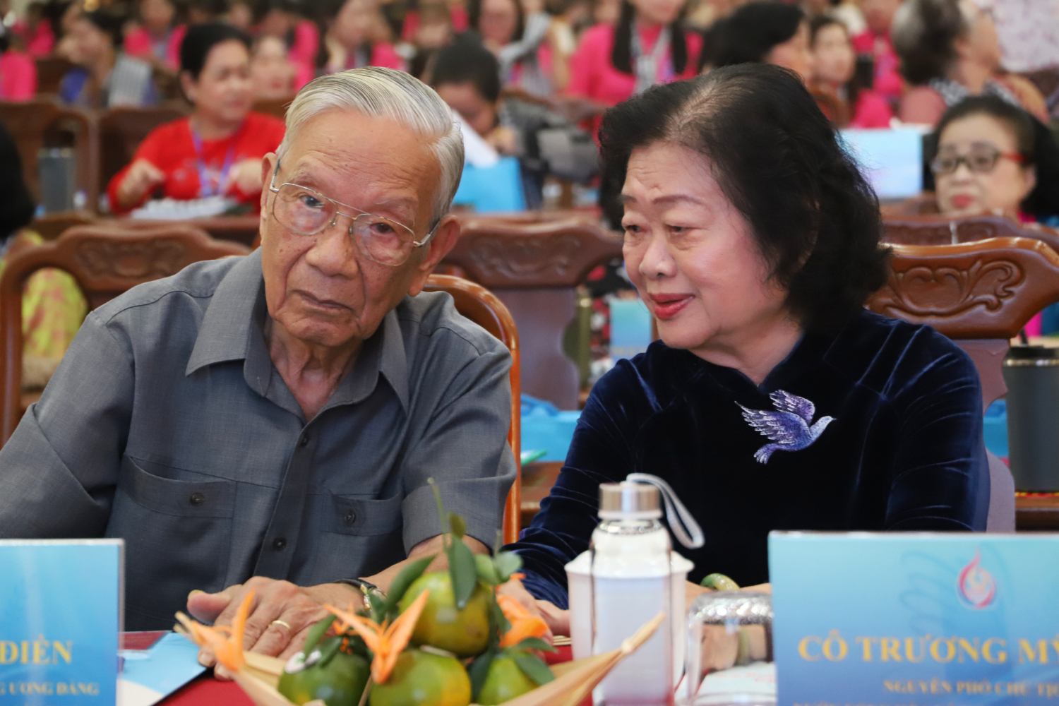 Nguyên Bí thư Trung ương Đảng, nguyên Phó Chủ tịch nước, nguyên Chủ tịch Hội LHPN Việt Nam Trương Mỹ Hoa trao đổi cùng nguyên Ủy viên TƯ Đảng, nguyên Bí thư Thành ủy Cần Thơ Lư Văn Điền trước giờ khai mạc Đại hội