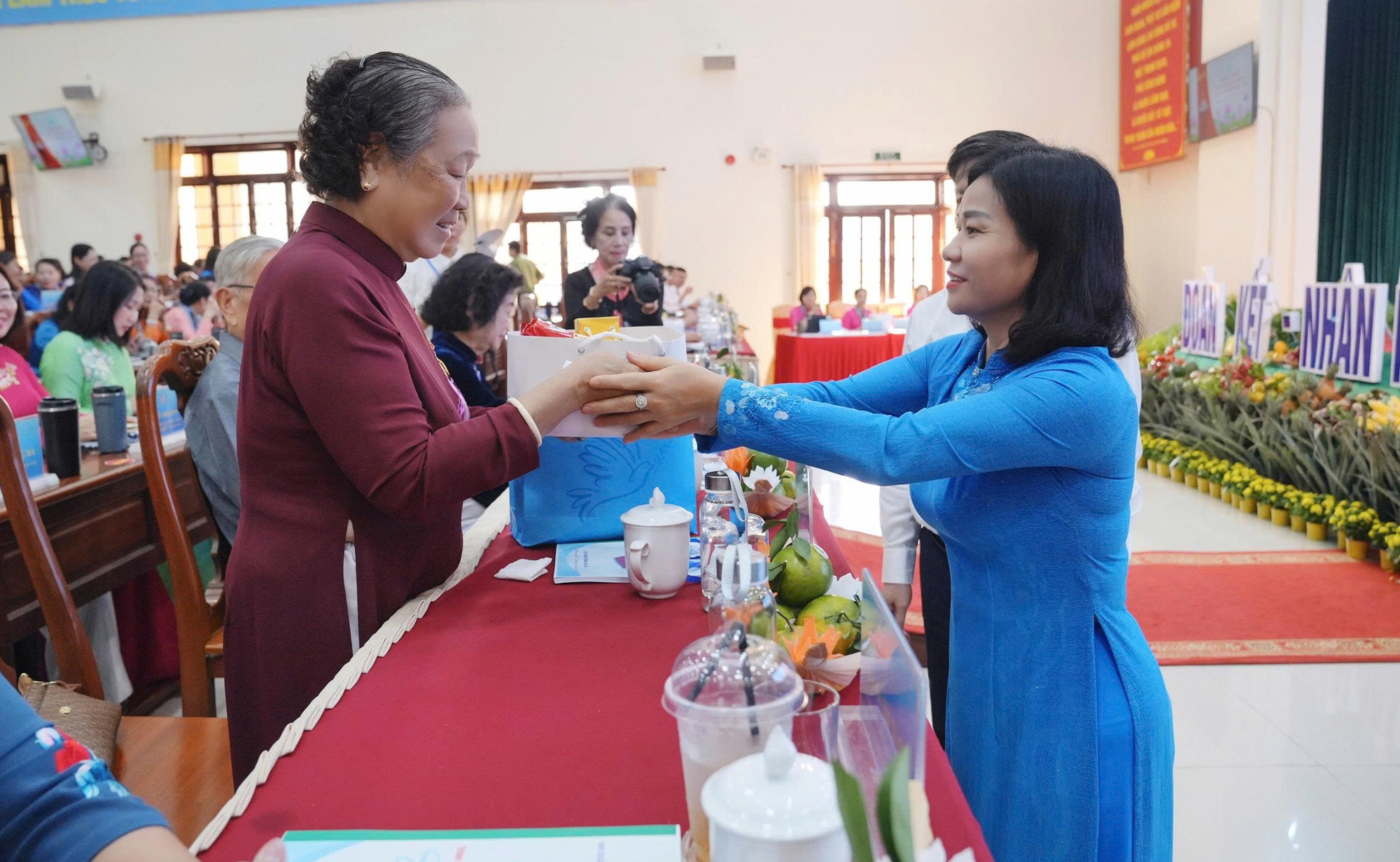 Ủy viên TƯ Đảng, Phó Chủ tịch UBTƯ MTTQ Việt Nam, Chủ tịch Hội LHPN Việt Nam Nguyễn Thị Tuyến (bên phải) tặng quà Mẹ Việt Nam Anh hùng Trần Thị Tơ