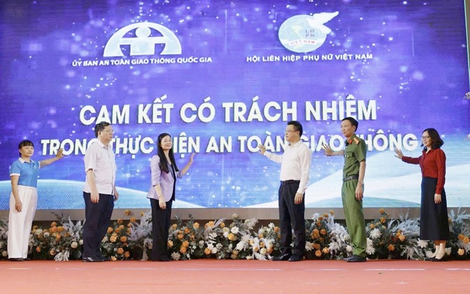 Bà Nguyễn Thị Thu Hiền (thứ 3 từ trái sang), Phó Chủ tịch Hội LHPN Việt Nam; ông Lê Kim Thành (thứ 3 từ phải sang), Phó Chủ tịch chuyên trách Ủy ban An toàn giao thông Quốc gia, cùng các đại biểu phát động "Cam kết có trách nhiệm trong thực hiện an toàn giao thông"
