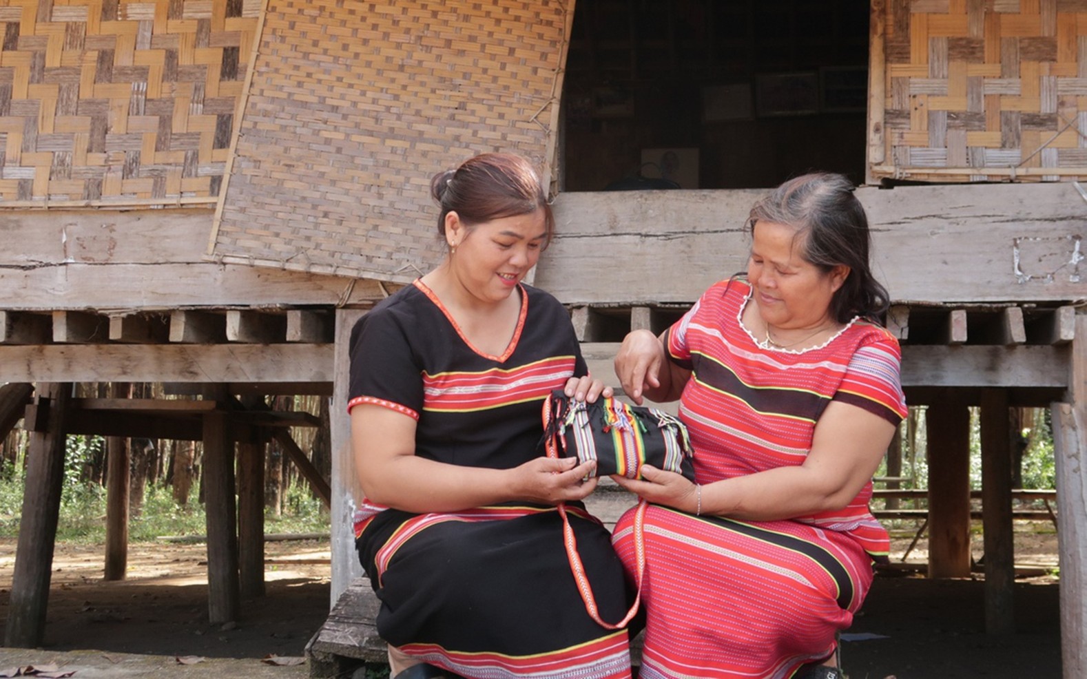 Chị Y Loan (bên trái) trao đổi kinh nghiệm về dệt thổ cẩm cùng một nghệ nhân trong làng