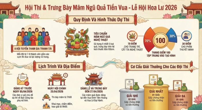 Ninh Bình: Hội thi và trưng bày Mâm ngũ quả tiến Vua tại Lễ hội Hoa Lư năm 2026 sẽ diễn ra trong 3 ngày