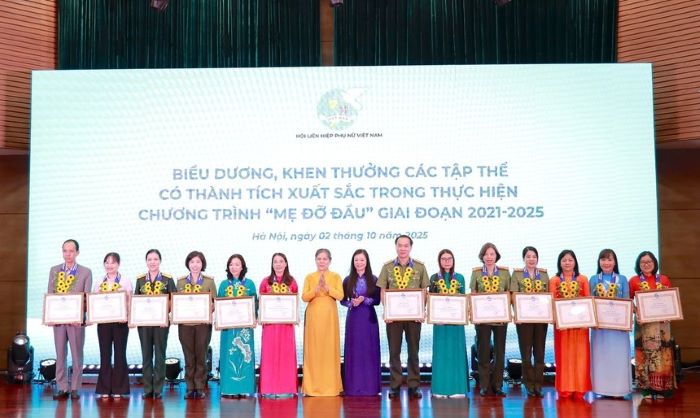 VWU Vice President Nguyen Thi Thu Hien and former VWU President Nguyen Thi Thanh Hoa present Certificates of Merit to outstanding groups implementing the “Patron-Parents” program in the 2021-2025 period.