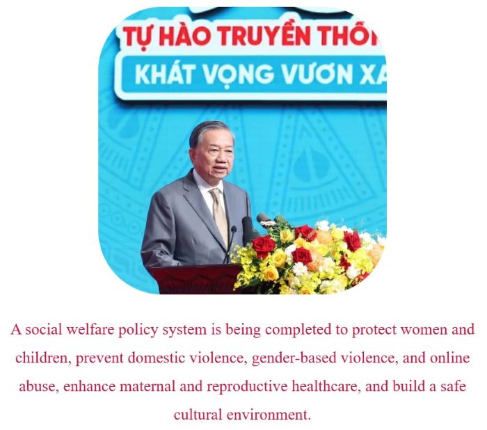 He stated that Vietnamese women in the new era should be characterised by “Patriotism – Independence – Courage – Compassion – Intelligence – Creativity – Responsibility – Digital Transformation – Green Transition”, encouraging the establishment of at least one women-led livelihood or cooperative project in every province and city.